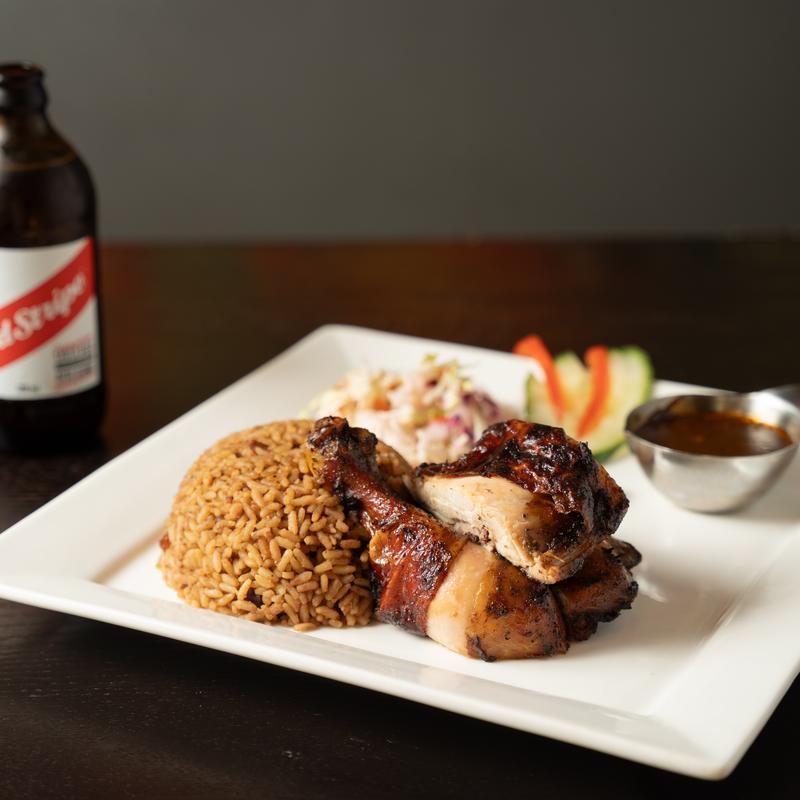 Served with Rice and Peas, Coleslaw, and Plantain.