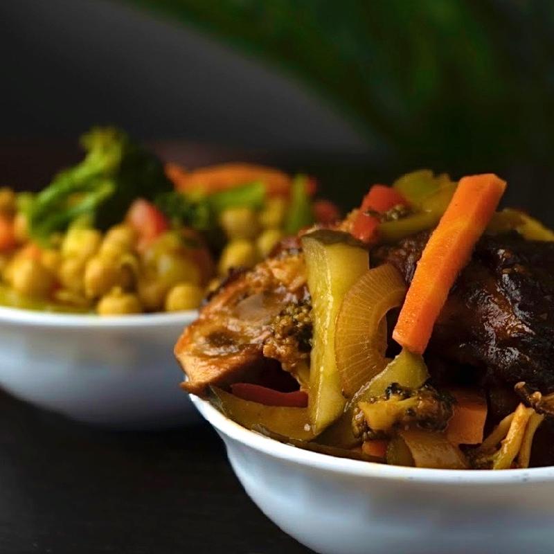 Our Jerk chicken, brown stewed with vegetables.