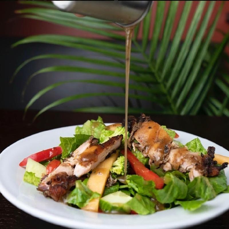 Boneless jerk chicken served on a bed of fresh lettuce, garden vegetables, and cantaloupe with our house dressing.